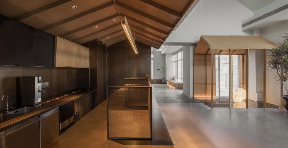 工作室入口没有LOGO墙,也没有前台,入口正对着的是一个8米长的咖啡吧,咖啡机与厨房设备俱全,这里是工作室同仁休息与分享的地方。