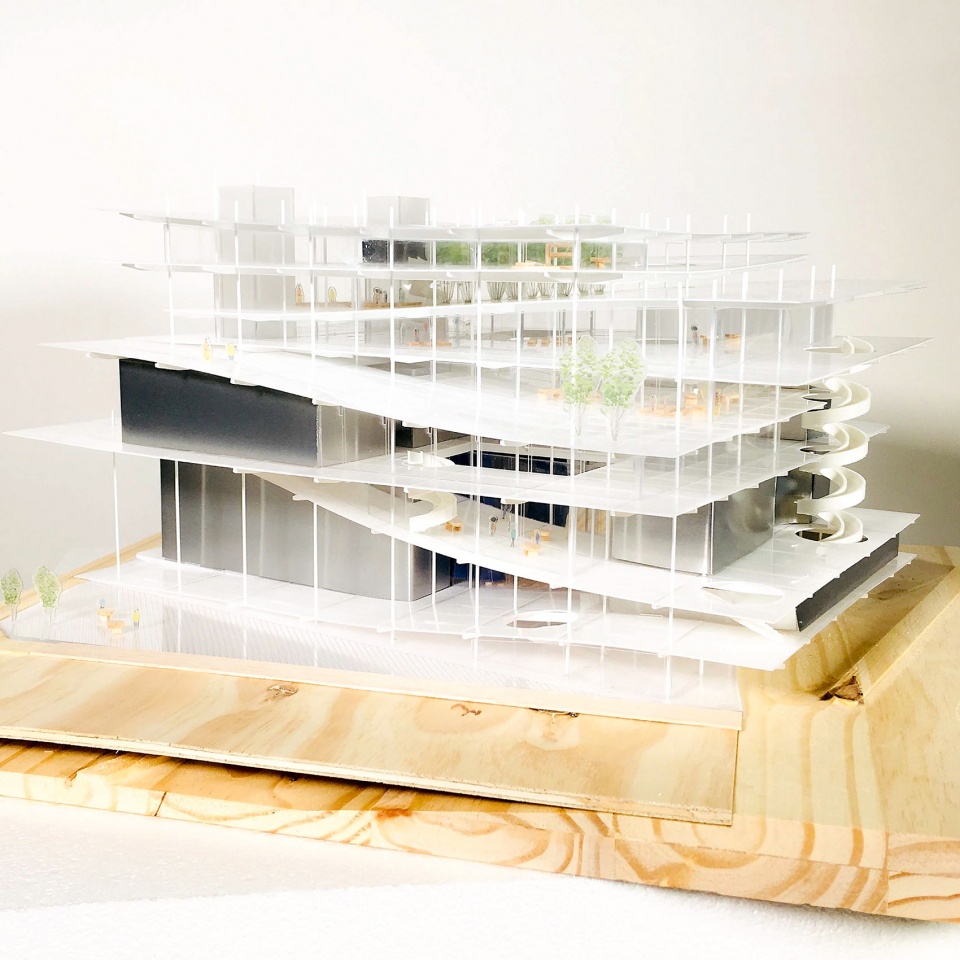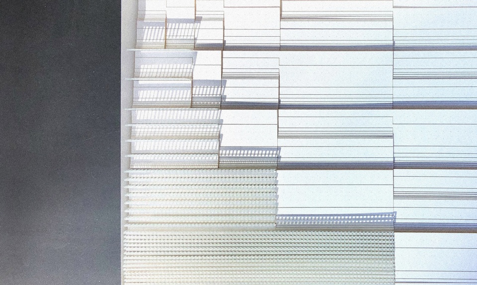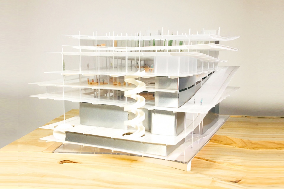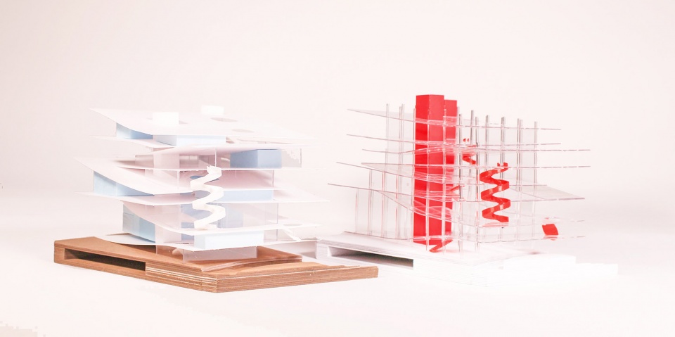 Boston Musical Center is a multifunctional performance facility shared by the Berklee Music College, the Boston Conservatory, and the Boston Lyric Opera. It contains a variety of programs, including concert halls, rehearsal rooms, classrooms, offices, and residential halls. Located at the crossing of two urban arteries, the center will serve as the icon of downtown Boston as well as the new cultural center. In response to the urban position, the proposal aims to design a transparent and democratic building for the public. The building is composed of slanted floor slabs with open plans that minimize the visual barriers between the building and the city. The playful floor slabs function as a performing stage, revealing the interior activities to the streets. Light wells and vertical circulations are inserted into the floor, slabs to promote internal connections.