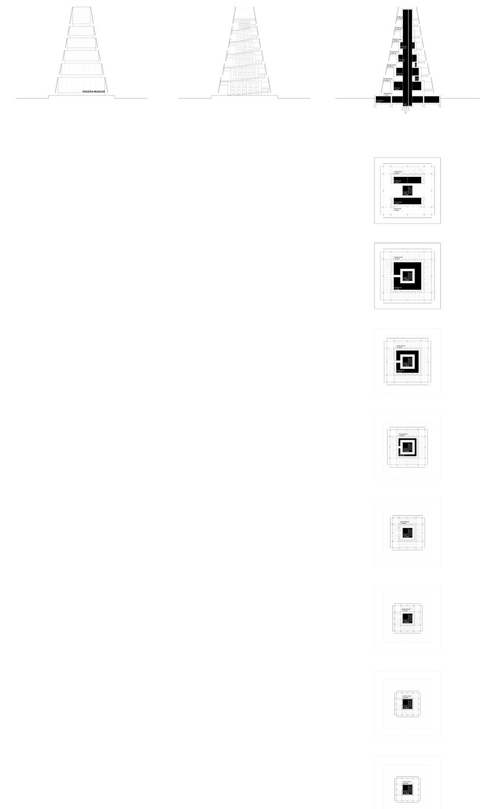 As a typology, Pagoda was first introduced in China from India during the 5th century as a Buddhism structure. The typology evolved into diverse forms built with different materials such as timber, brick, and rammed earth through the following centuries. Despite the variety, the pagodas share several qualities that make them the ideal candidate to be converted to contemporary museums. The majority of the pagodas have a clear spiral visiting route that leads the visitors to each level. The revolving motion is closely tied to the Buddhism concept of reincarnation. Along this religious route, sculptures are displayed in the niches carved in the solid core, making the journey a pious and educational experience. Clarity of the visiting path and the exhibition niches coincide with the programming requirement of the modern museums, leading to my experimentation with contemporary adaptations.