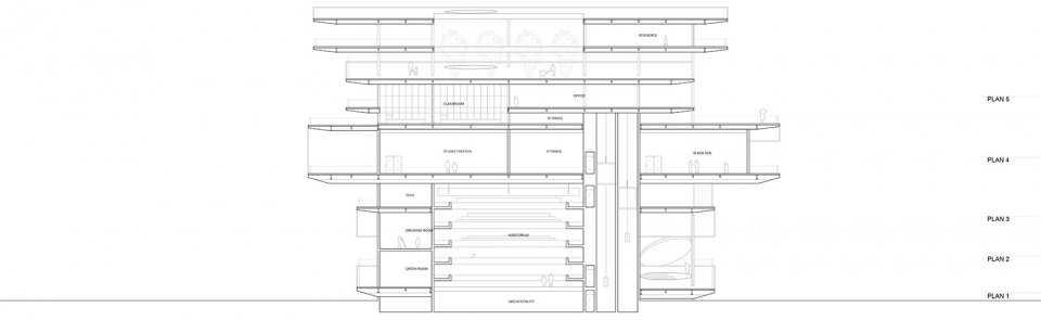 波士顿音乐中心是一个多功能演艺场馆,由伯克利音乐学院,波士顿古典音乐学院,波士顿歌剧院三家机构共同分享。内部设有剧院、排练室、教室、办公室、艺术家驻场中心等项目。音乐中心坐落在波士顿两条主干道交界处,重要的地理位置赋予其地标性的建筑意涵。为了反映其对波士顿这座城市以及公众的重要性,设计旨在创造一个平等、开放的空间,欢迎艺术家和大众一起构建这一新兴文化中心。大楼由一系列弯曲的楼板组成,开阔的平面营造出通透感,最大程度的将艺术生活呈现在公众面前。纵向的天窗,弧形楼梯穿透楼板,以创造层与层之间的连接。