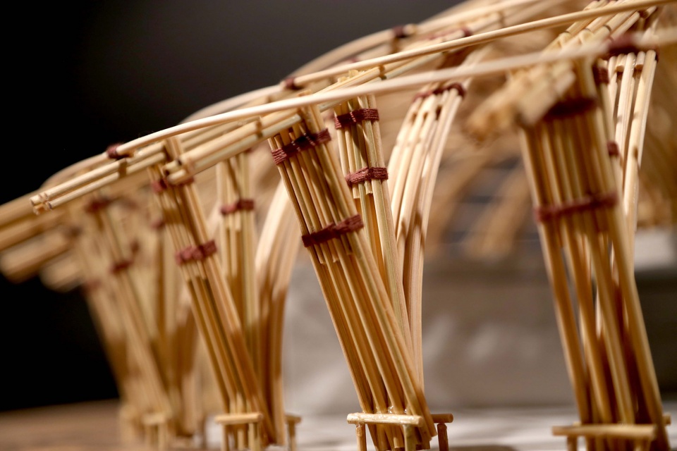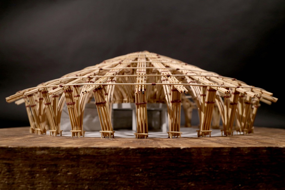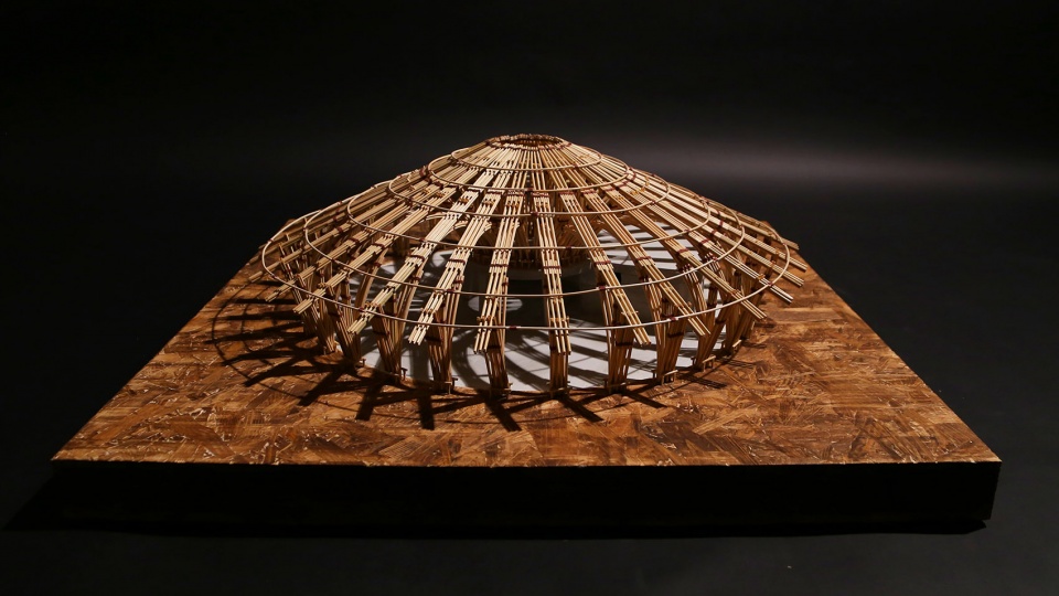 这个项目是结构课中所做的模型,考察在模型中对于结构、材料真实、细致、贴切的表达。我们选择了VTN Architects的Eco Resort Pavilion作为研究对象,使用竹签、棉线、混凝土、聚合粗木板等材料,经过浸泡、弯折、加热、组装等多道工序尽量真实的制成了1:30的大模型。