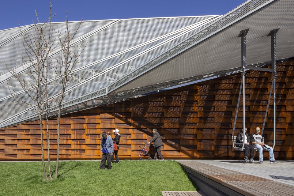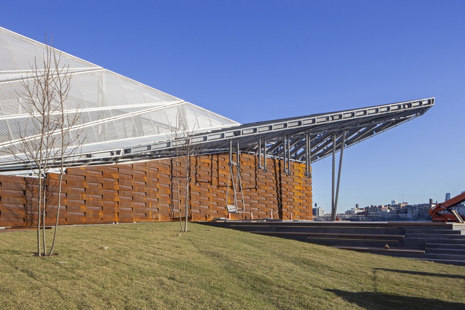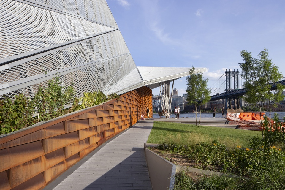 码头空间的设计采用类似手风琴的形式来塑造一种“折叠”感。一系列景观草坪和沙丘构成滨河步行道,种植着植物的倾斜折叠墙面作为通向城市的“绿色”广告牌。这面高35英尺,长度超过300英尺的屏风墙也有效地遮挡住了36号码头卫生部门的棚屋。项目使用的材料如金属线网与耐候钢墙板,让人们回忆起East River曾经是工作码头的历史。