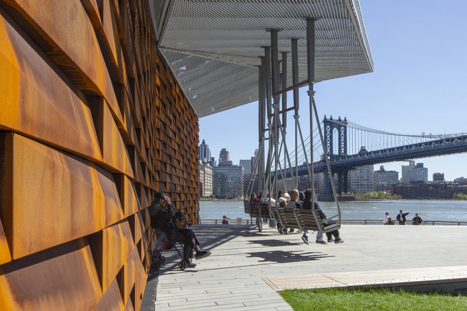 带有定制秋千的抬高廊道空间为人们提供了一处放松的地方,在这里可以欣赏到布鲁克林和曼哈顿大桥以及布鲁克林大桥公园的景色。