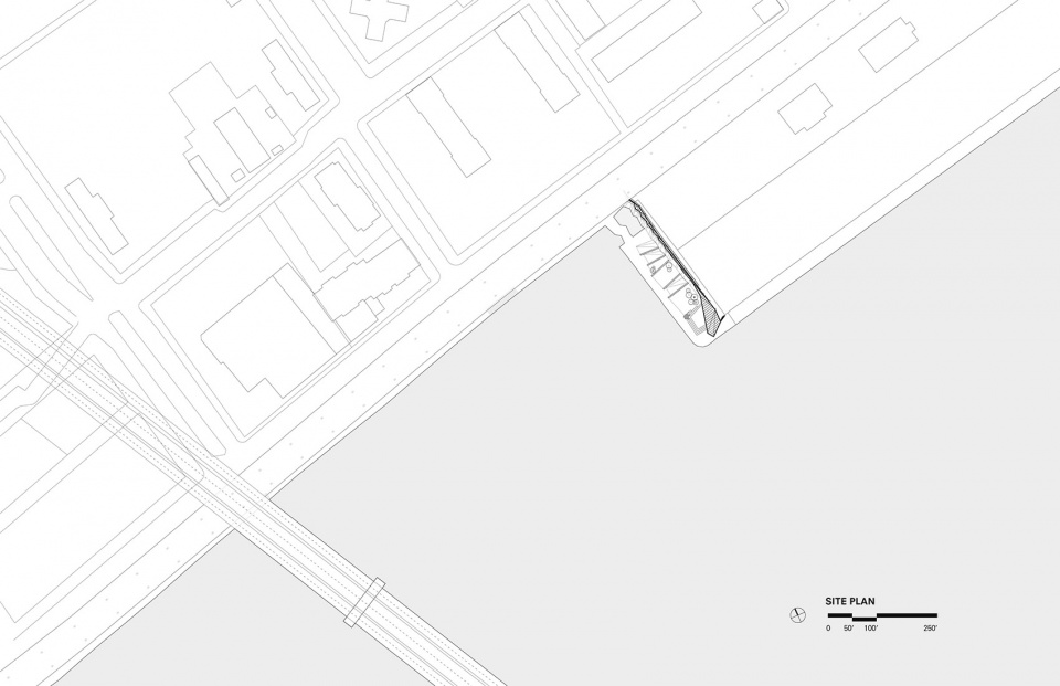 除此之外,在纽约国家沿海资源管理部门(New York Department of State’s Division of Coastal Resource)的大力资助下,Mussel Beach被打造为一种生态景观原型,再现了历史悠久的East River海岸线的特征。码头折叠的造型延伸下降至河流之中,形成一片斜坡场地,连接着每天涨落的潮汐。栖息地公园的特征如倾斜的预制混凝土地面、表面纹理和潮汐带中的假山等特征都是专门针对蚌类设计的。