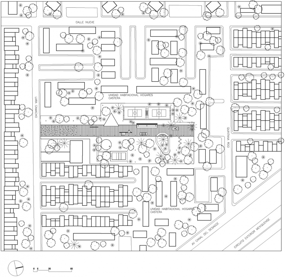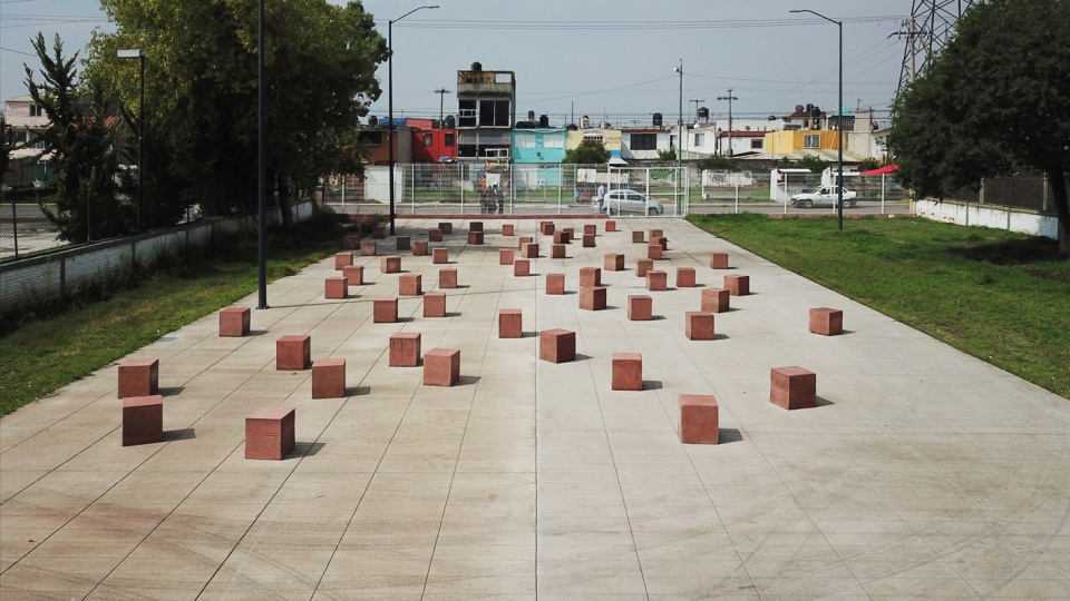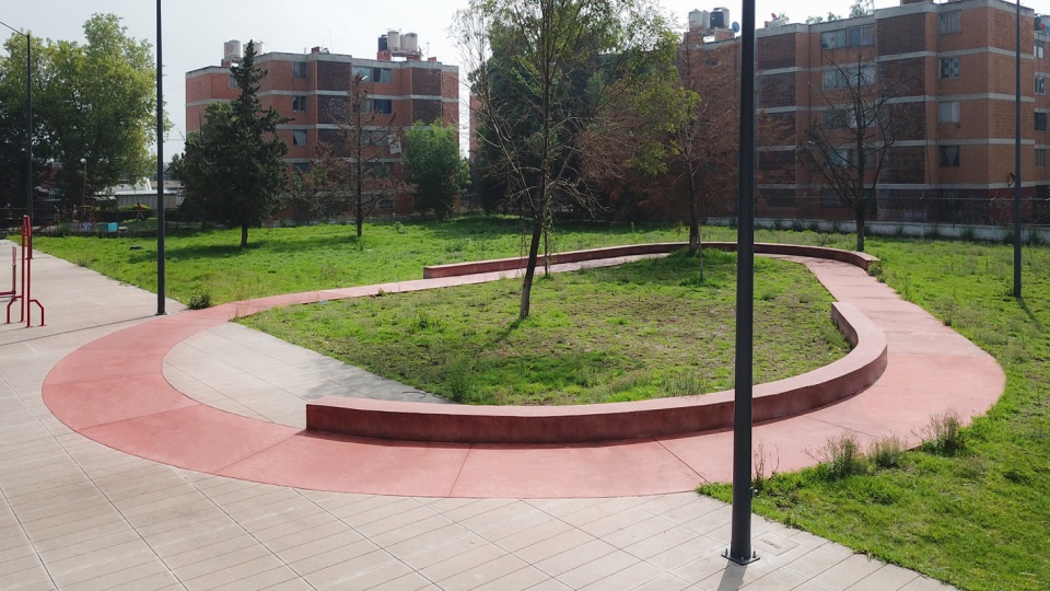 The project, located in the Hogares Castera housing unit in the Municipality of Tultitlán, is an initiative made by INFONATIT and the CIDS (Centro de Investigación para el Desarrollo Sostenible). It mainly consists of a 15m wide by 200m long concrete corridor, along which various elements built in concrete with integral color that make up recreation spaces are grouped together.