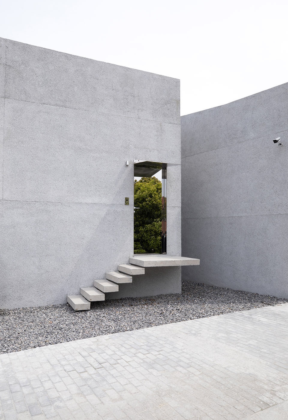 Regarding the way to enter the building, we hope that it is not only in the path of people flow, but also maintains some interesting interaction between the visual and the small forest on the front of the building. Using a narrow entrance and high reflection imaging as a “gate” to mirror the surroundings can assemble the external changing reality on the clean building façade.