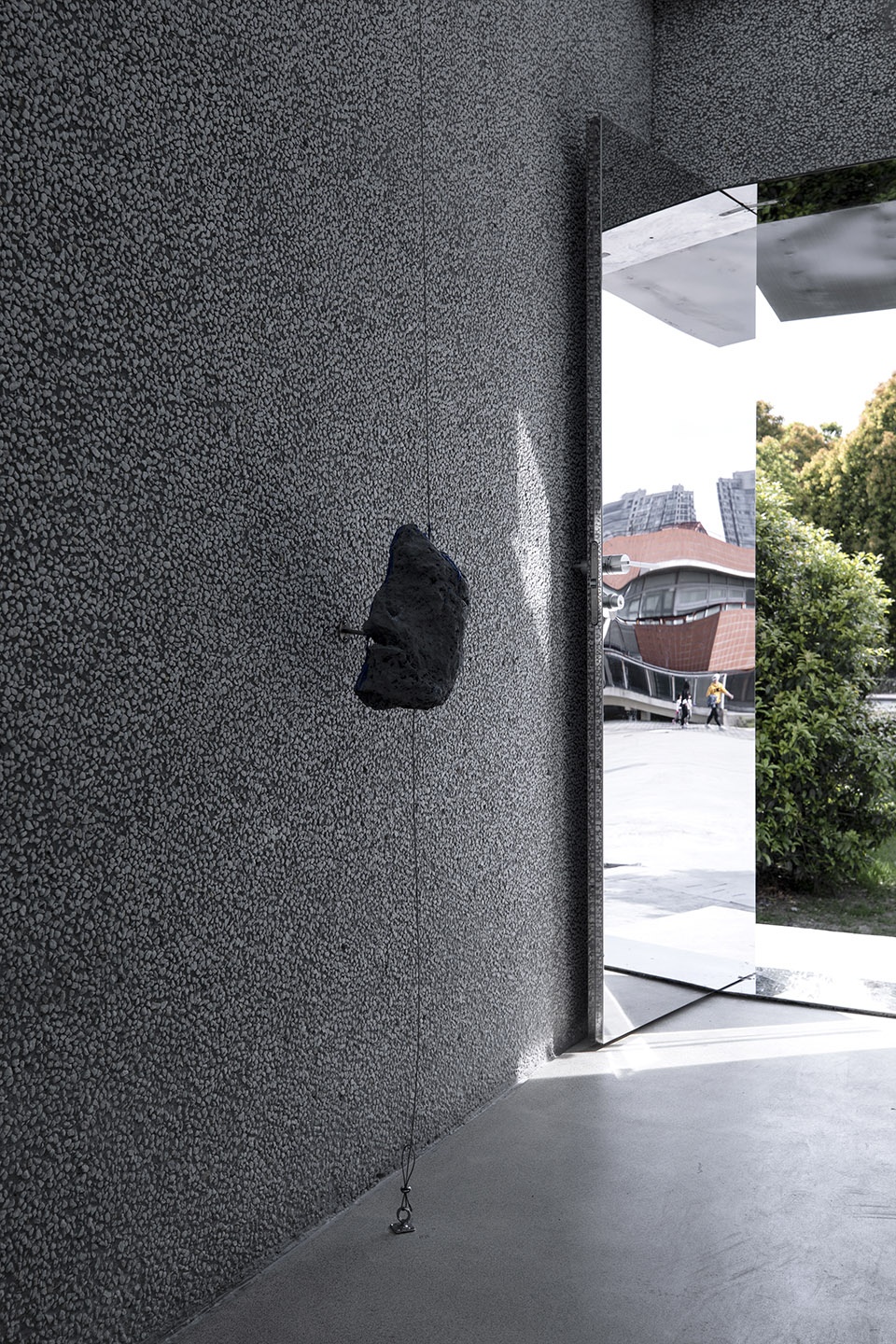 对于进入建筑的方式我们希望不仅仅是在人流路径上,更希望在视觉与建筑正面不大的小树林保持某种有趣互动,以一个窄小入口并使用高反射成像做“大门”去映射周边环境,在洁净的建筑立面拼贴外在可变的真实。