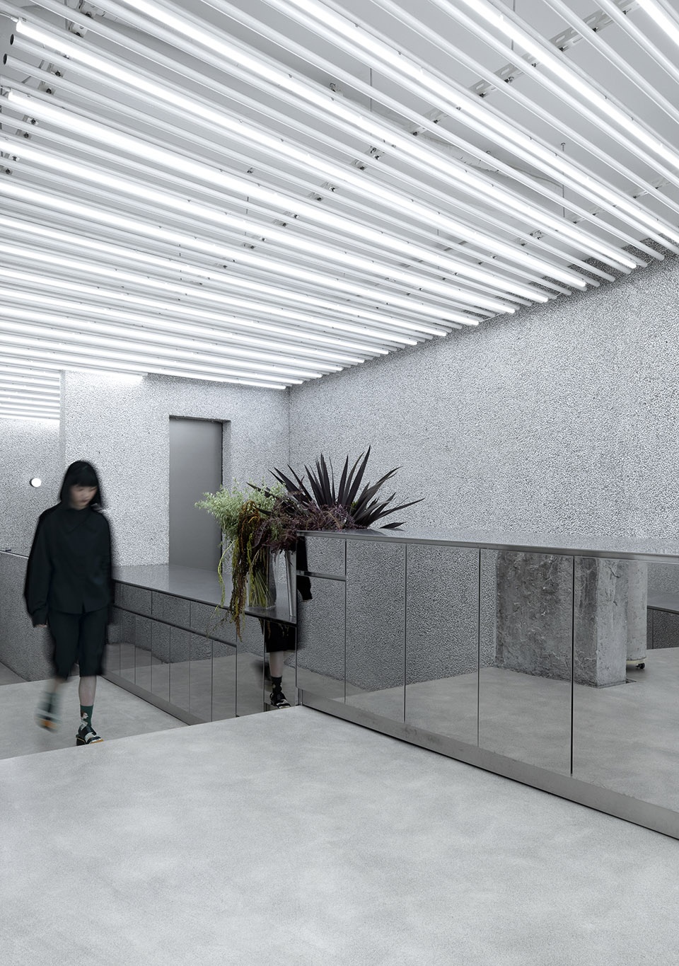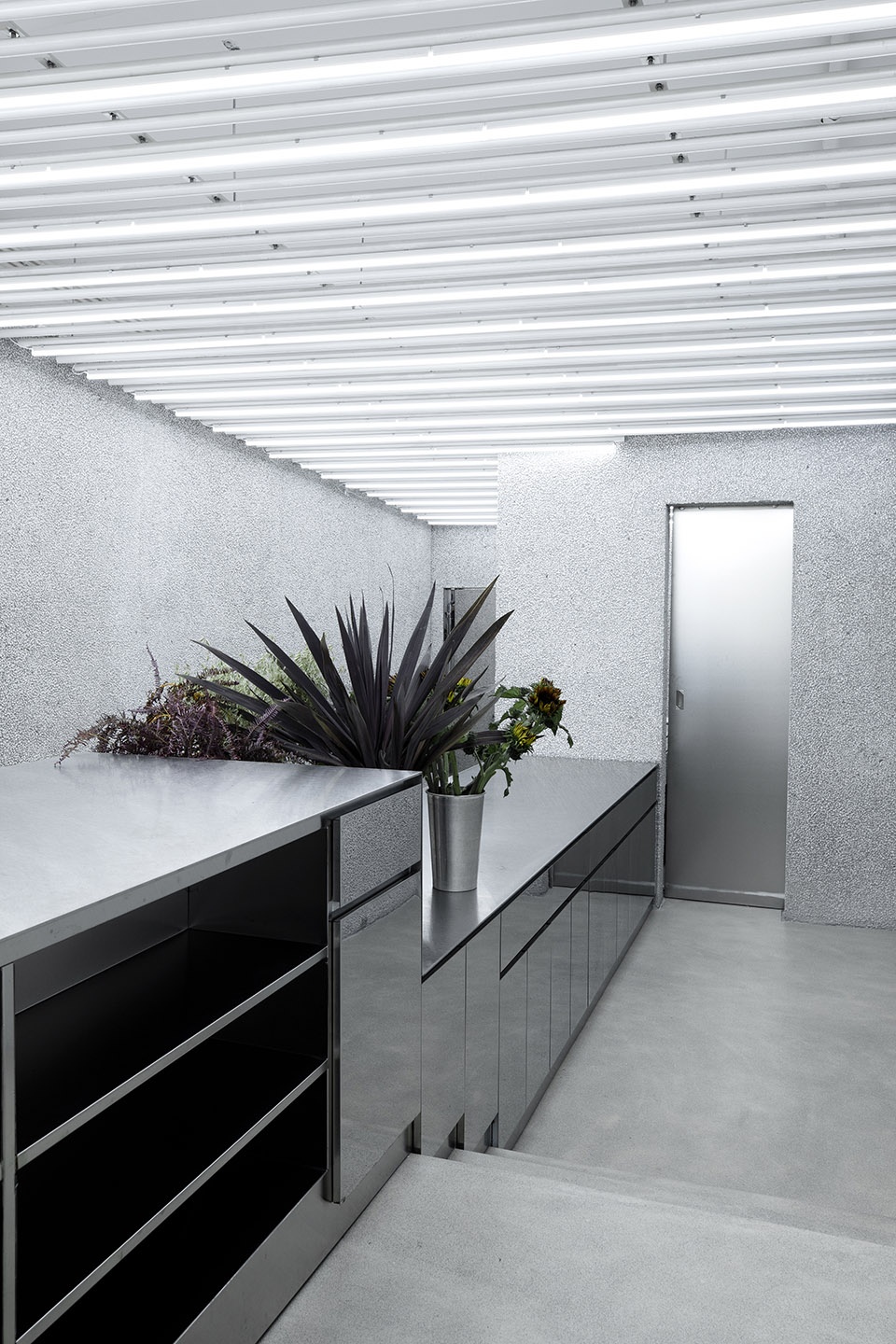 The simple and sturdy linear arrangement of the ceilings and the zonal lighting in slices provide more uniform and precise lighting conditions for the brightness and good color rendering of flowers and vegetation, highlighting the existence of mutual creation between flowers and florists in this space.