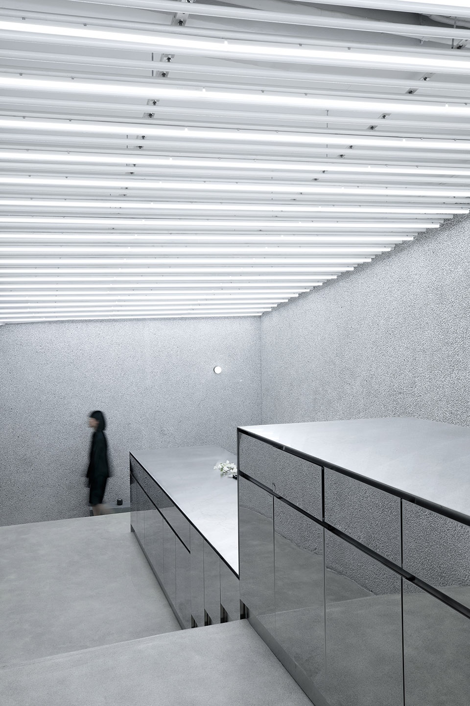 在天花的处理上简洁凌厉的线性布置,成片状分区照明,对花材与植被的亮度与良好显色性提供更加均匀精准的照明条件,突出该空间下花艺与花艺师相互创作的存在。