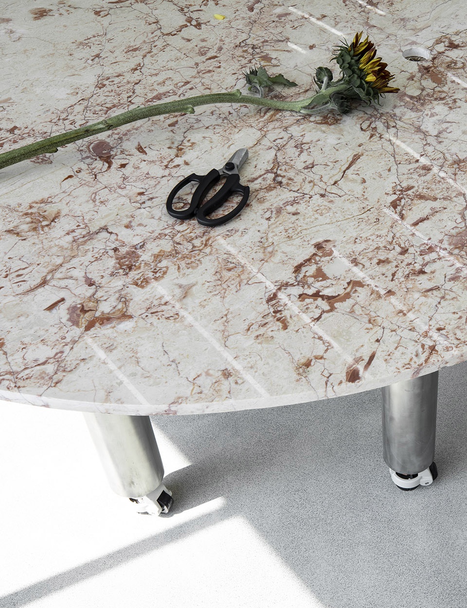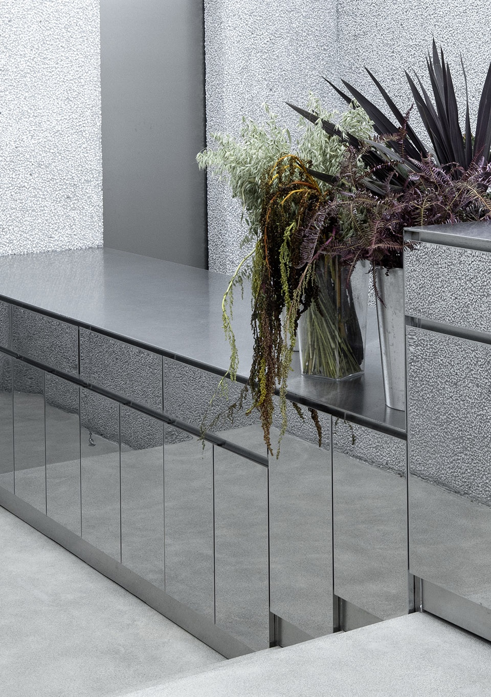 项目初始我们提出一个出于自我整理的疑问,并实践在项目始末;封闭的外立面使室内空间与外界某种断绝,极富生命力的花植与清冷的石材金属,以何种相处模式存在并能为花艺创作与教学带来怎样可能?
