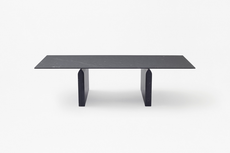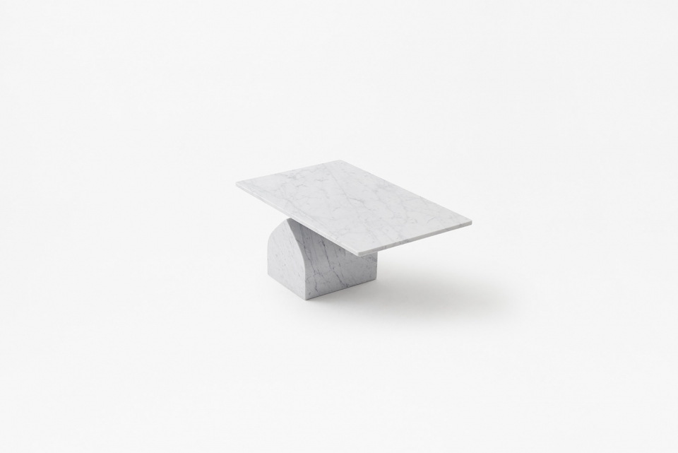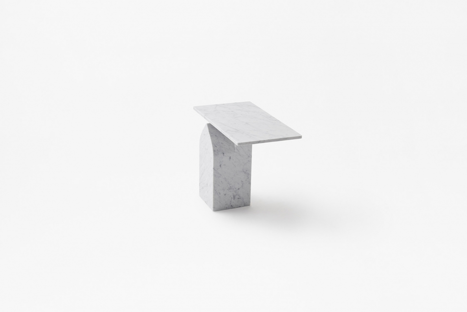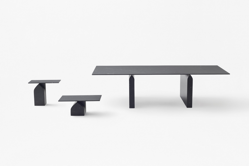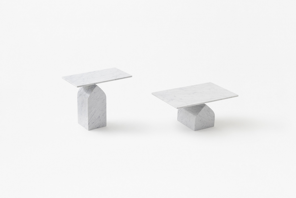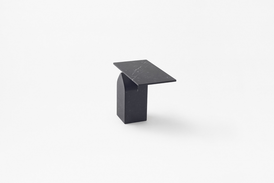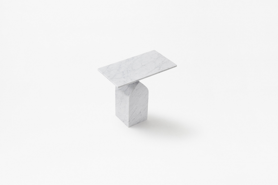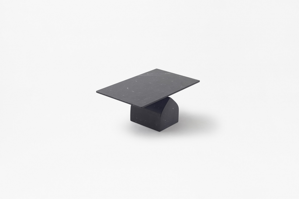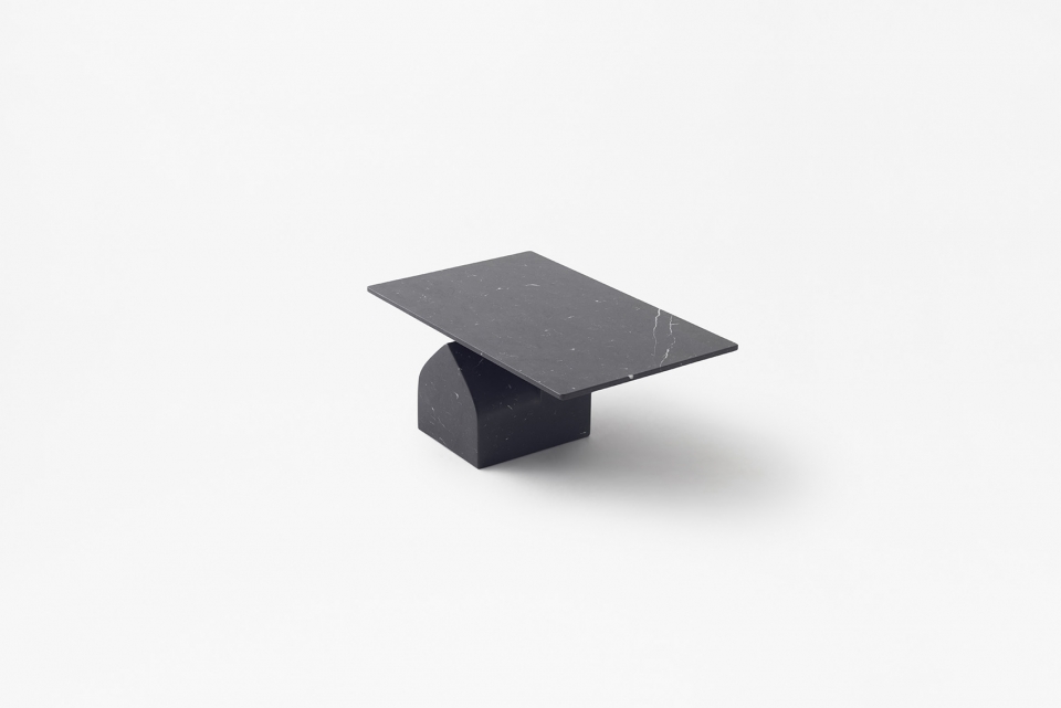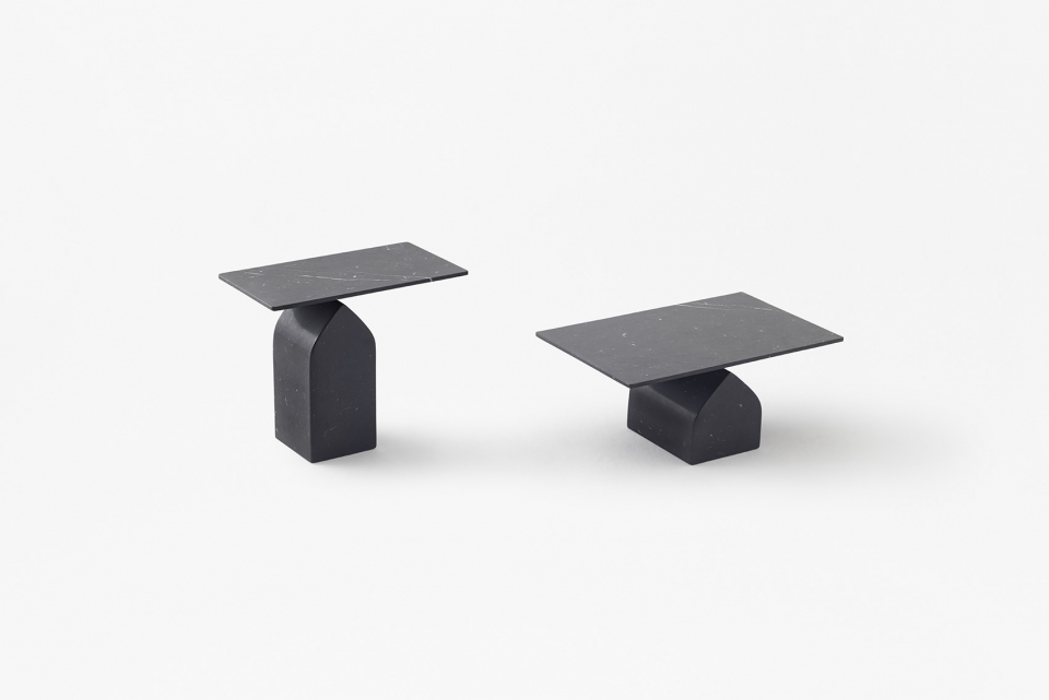 Although the table top and the base are securely fastened together, the solid, heavy top plate seems to almost float above its “pointed” base, achieved by tapering the top of the legs and the underside of the table, it gives the impression of weightlessness. The impression becomes even more distinct as the side table uses the base’s weight to allow for the top to be asymmetrically offset. The collection utilizes the material to give off a contradictory impression between the natural heaviness of the marble and the lightness of the design.