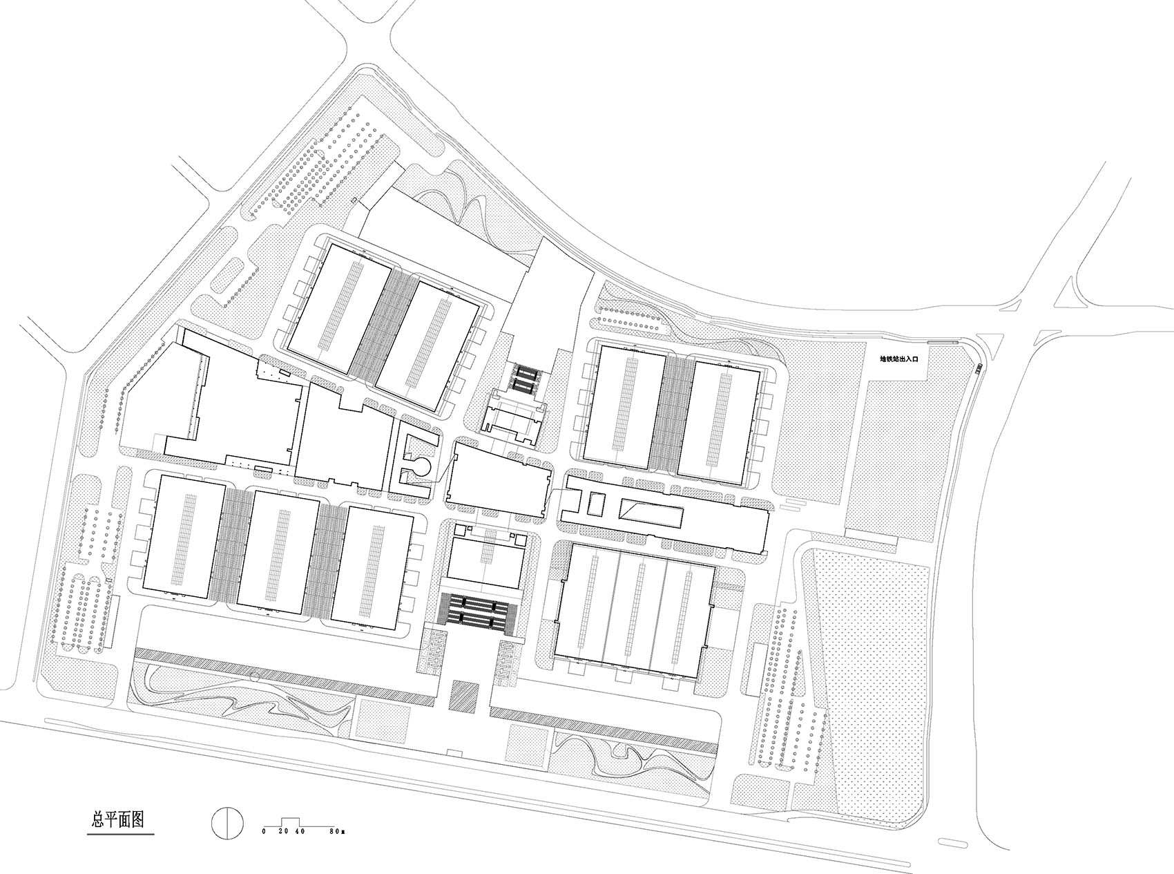 1、 围绕会展建筑的开放城市空间。场地不设围墙市民可以自由出入,靠近城市干道界面多设置近人尺度景观小品,鼓励与外部互动与交往。同时将原规划贯穿东侧绿地的地面车道改为地下车道,将北侧园博园到南侧滹沱河公共绿地休闲步行通道连为一体,为市民创造丰富、连续、宜人的公共开放空间。