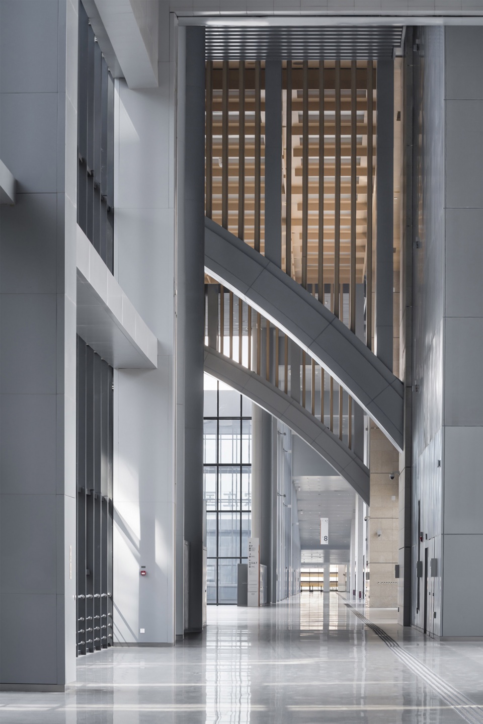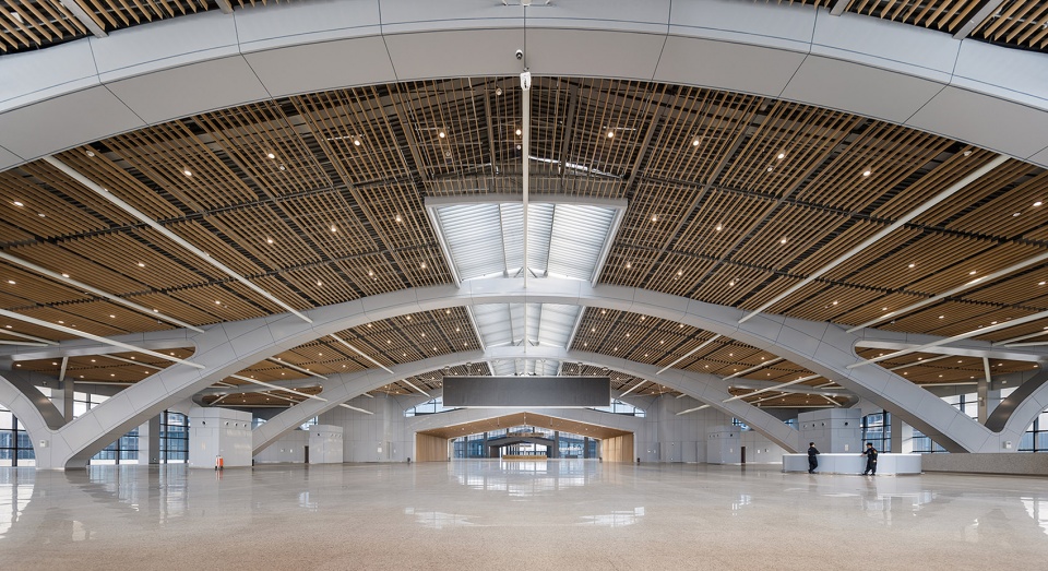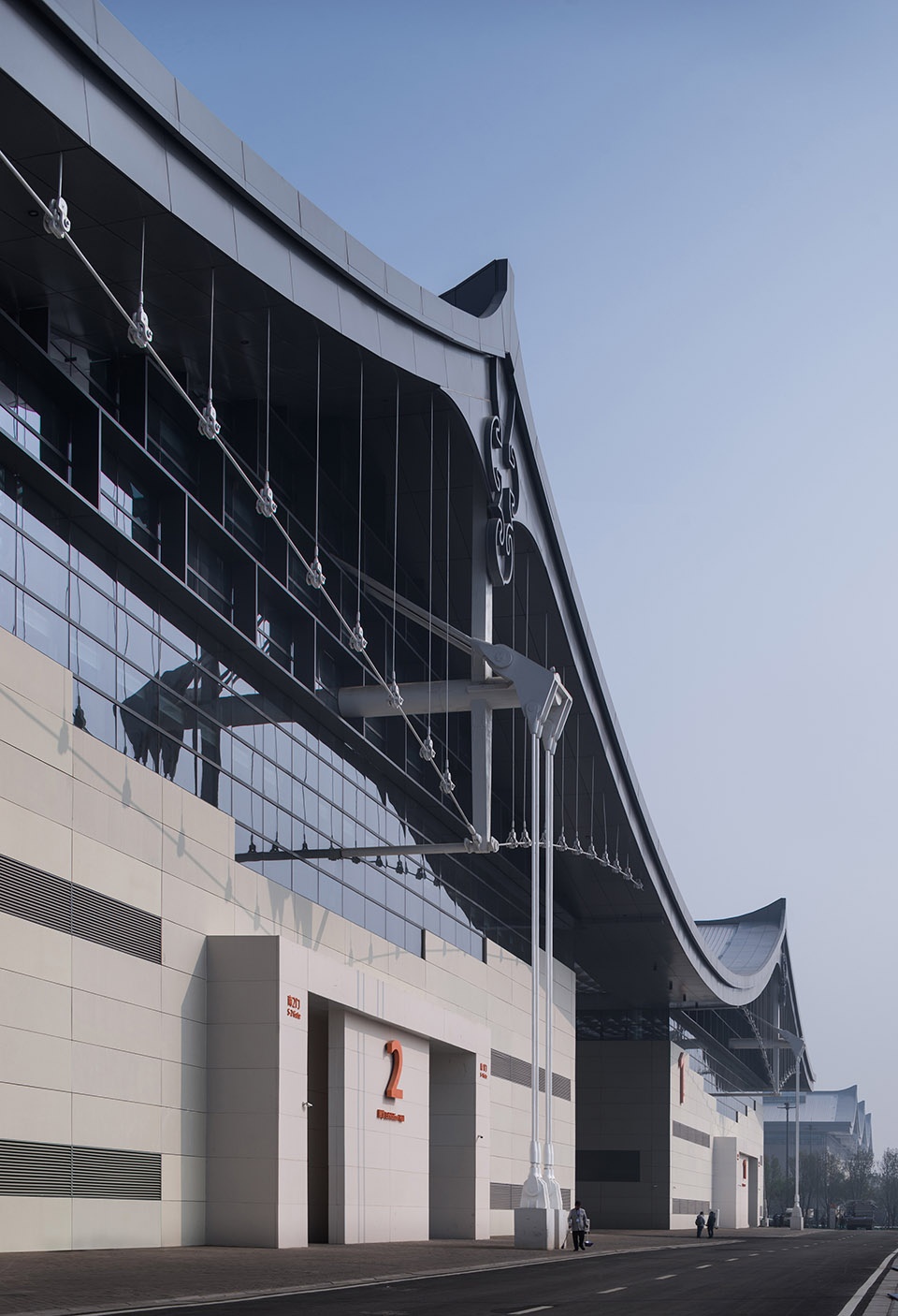 Shijiazhuang International Convention & Exhibition Center in Zhengding New District of Shijiazhuang city covers an area of 64.4 hectares and a floor space of 359,000 m2, including 229,000 m2 above ground. All areas for conventions and exhibitions extend along the hub in the shape of the fishbone. The multi-elevation pedestrian system facilitates the diversion of people, vehicles and goods. The exhibition area incorporates seven standard exhibition halls covering an area of 11,000 m2 each and one large multi-purpose exhibition hall of 26,000 m2. Boasting a floor space of 110,000 m2, the exhibition area has been the world’s largest exhibition hall featuring the cable-suspended structure.