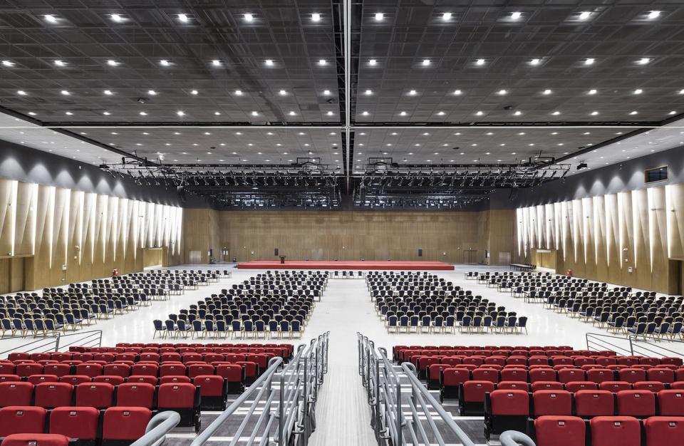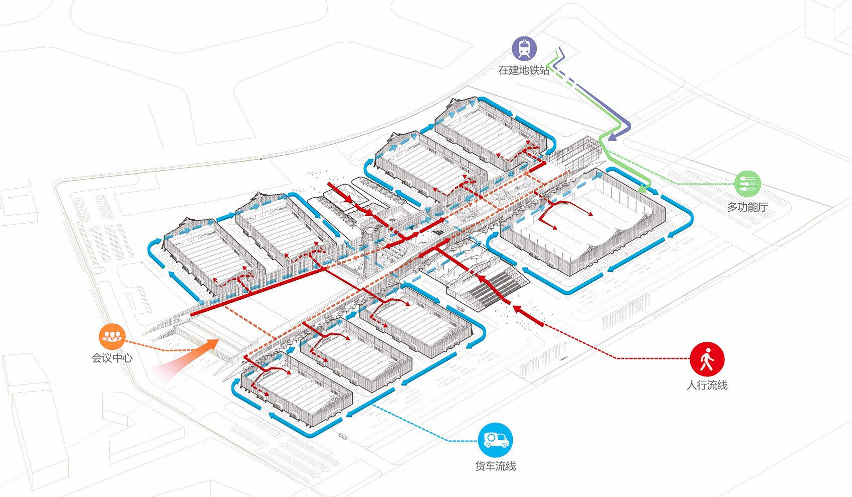 2.Combine functions in a flexible and efficient manner. A multi-elevation system is built so that the paths for the freight and the people won’t cross. The exhibition hall extends along the hub in the shape of the fishbone, with two or three exhibition halls in a group. In this way, it can serve coherently as a whole or operate independently in groups. A relatively isolated multi-purpose exhibition hall is set up, covering an area of 26,000 m2, to serve the purposes for exhibitions, conferences, artistic performances, and competitions. The large performance hall is fitted with no fixed seating, with a few movable seats in the rear. If necessary, the performance hall can be divided into two to four small ones and the grand banquet hall of about 3,000 m2 can be divided into three parts for independent operation.