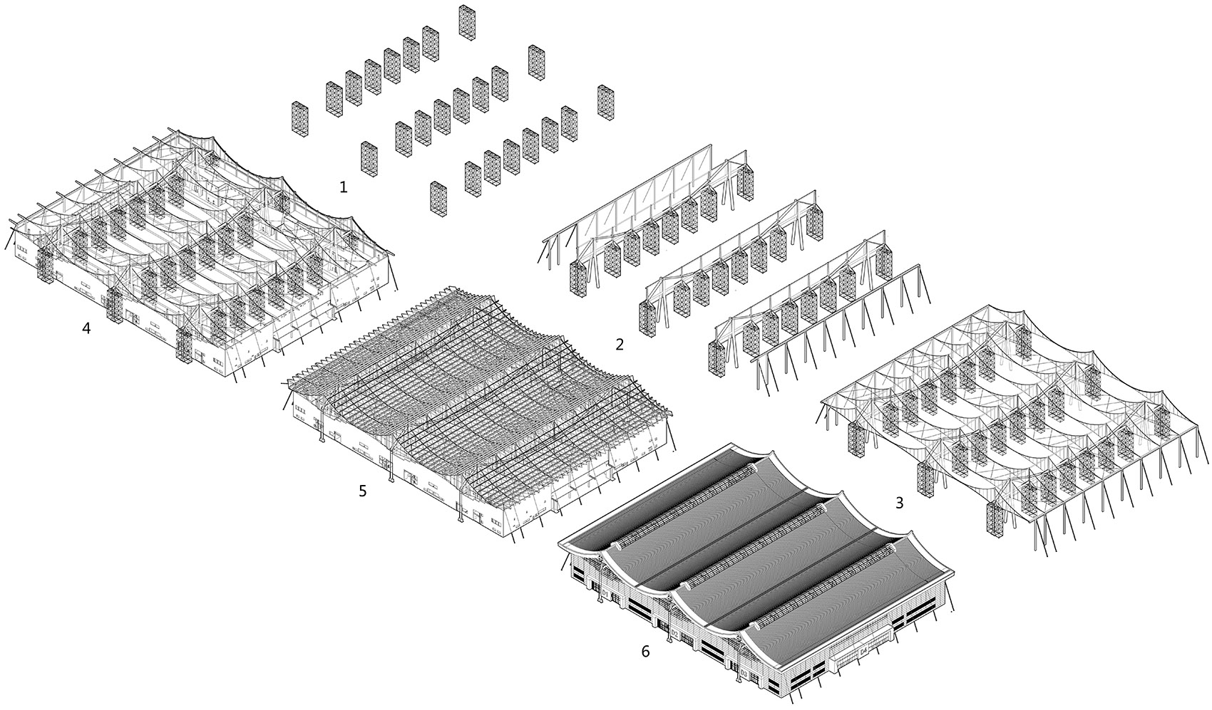 ▼展厅索结构施工顺序,cable-suspended structure construction process ©THAD