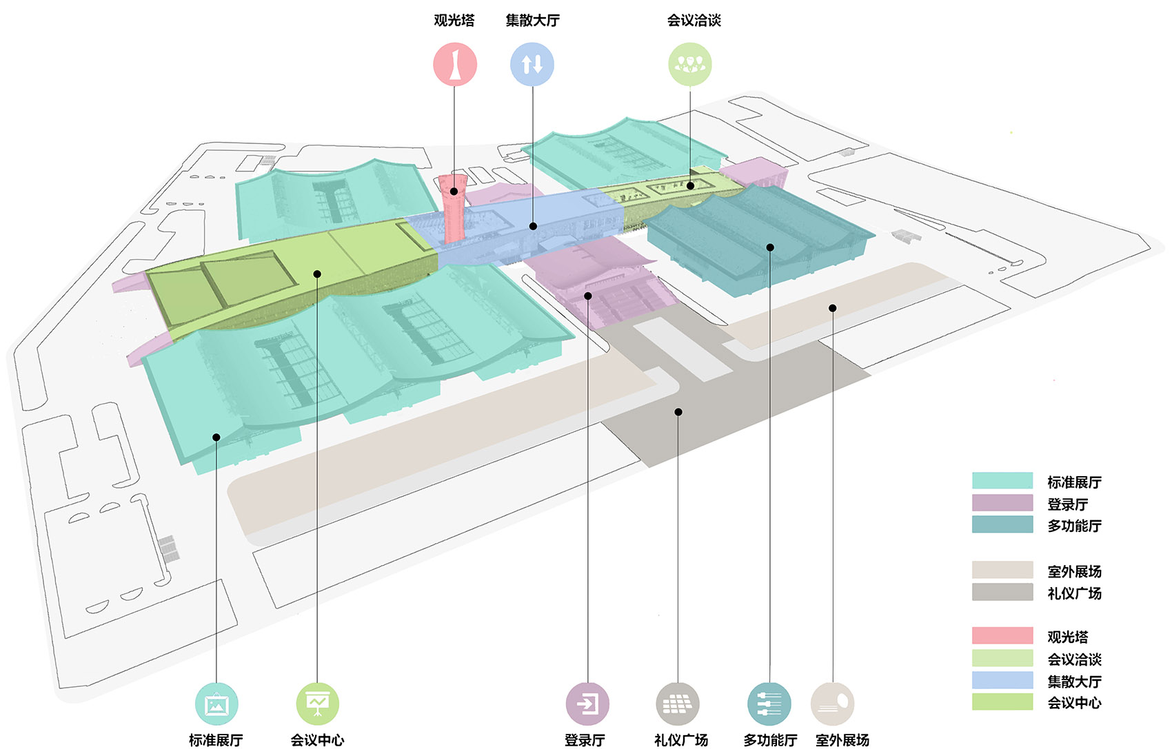 2、 灵活高效的功能组合。建筑设置多标高平台系统,供货线路与人行流线互不交叉。展厅沿枢纽区鱼骨式生长,两三成组。既能保持整体运营的连贯性,又相对成组团独立对外经营。设置一个相对独立的6万m2多功能展厅,承担包括展览、会议、演艺、赛事等功能。大观演厅采用无固定坐席布置,后排设置少量活动座椅,可根据需要分隔成2-4个小厅。约3000m2大宴会厅也可以分隔为3个小厅独立运营。
