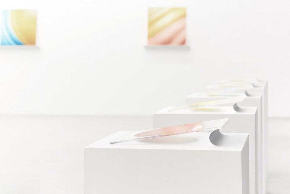 Because the exhibited works were high-resolution prints on acrylic panels, the pieces were displayed by supporting them with flexible and rebounding thin metal plates rather than by fixing them onto a surface such as framing, hanging from a picture rail, or wall mounting. For works displayed on walls, a delicate balance was sought by adjusting the flex according to the weight of the pieces-using stainless steel plates 0.2 mm thick for smaller works, 0.3 mm thick for relatively larger works, and so on. Further, works placed on exhibition stands were made to hover on one side by using 0.08 mm panels, to cast shadows of water balloons and increase the sense of buoyancy.