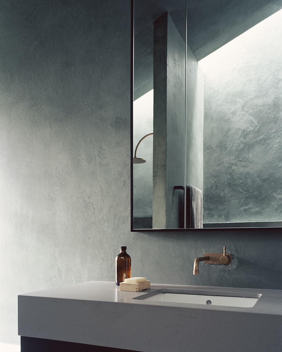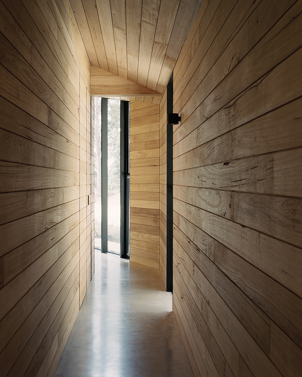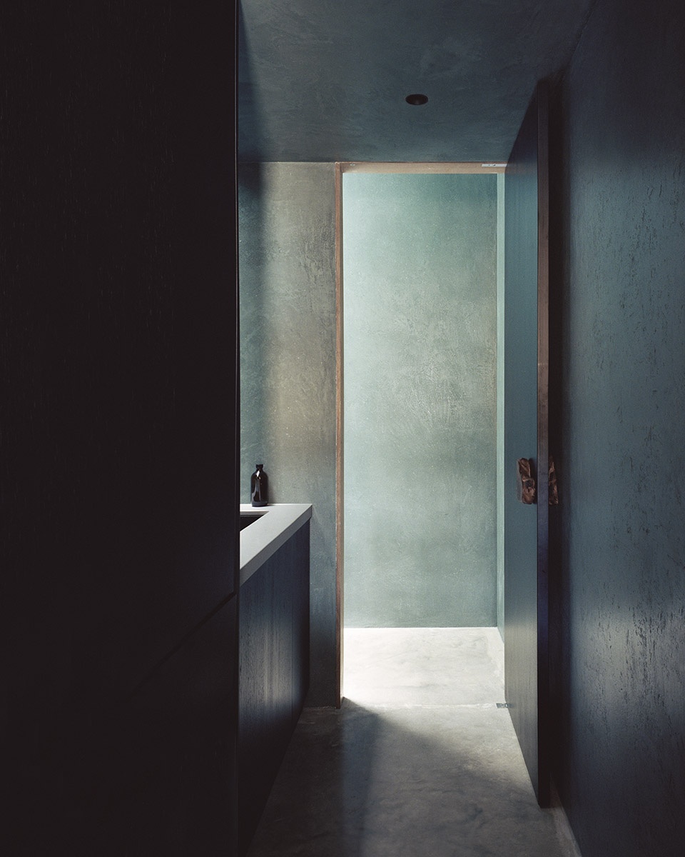 In the sleeping quarters the zoning, seamless sliding and pivot doors and increased acoustic control through timber-clad blockwork walls all work hard to create intimate, quiet spaces, secluded but still connected to bush and ocean. The bathrooms are intentionally located within the building, with low ceilings that release into full height shower spaces, lit by skylights. They are experientially different to the rest of the house as the soft light and cementitious render highlight the timber materiality present elsewhere.