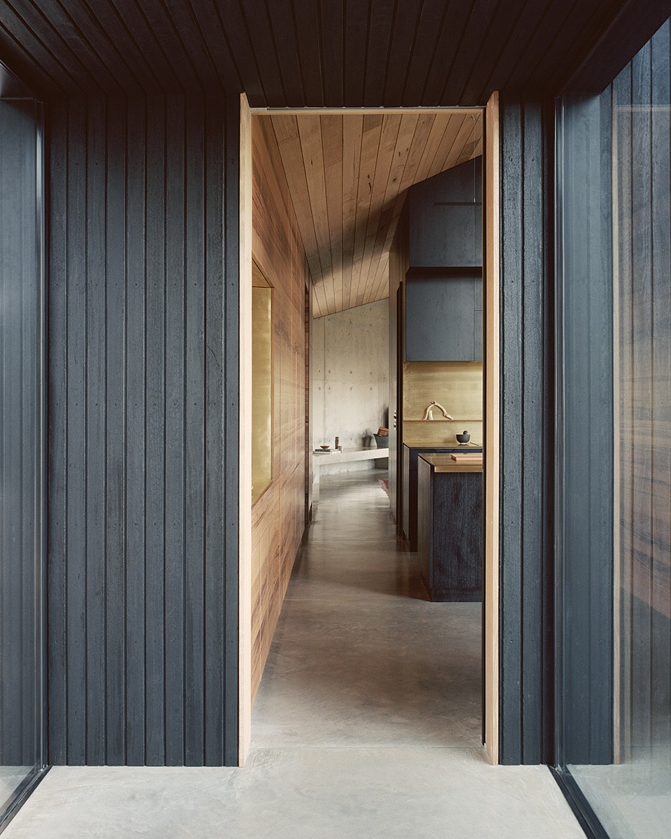 The social/living shed to the west is an open space occupied by a dark central box housing the kitchen, laundry, WC and living joinery. This box creates two volumes at either end of the shed forming the kitchen/meals areas and living/lounge. These are distinct spaces but still connected. Conversely the sleeping shed is divided repeatedly, creating compact bedroom and bathroom spaces, connected via a corridor to the south. A concrete wall in the living space necessary for bracing became an opportunity for a long shelf/seat and spot for a wood heater.