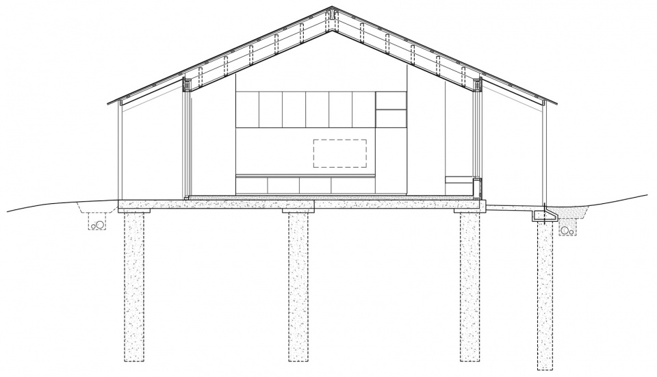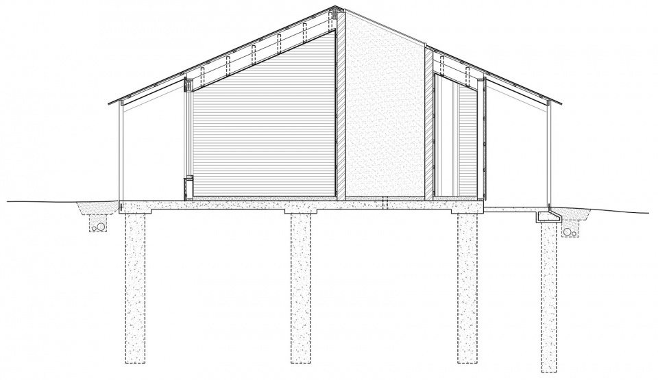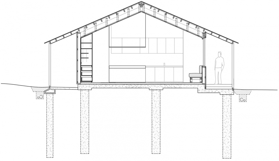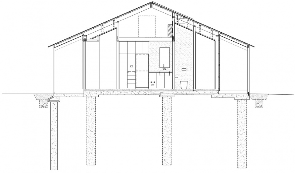 西边的社交兼起居棚屋是一个开放的空间,深色的中央盒子中设有厨房、洗衣房、卫生间和生活细木工房。该盒子将棚屋两端分为两个体量,形成了厨房、用餐区和起居、休息室。这些空间相互区别,却又紧密相连。相反,睡棚被重复分割为多间紧凑的卧室和浴室空间,并通过走廊通往南侧。起居空间中的一堵承重混凝土墙底部,演变成了一个长型置物架兼座椅,也为木制壁炉提供了摆放空间。