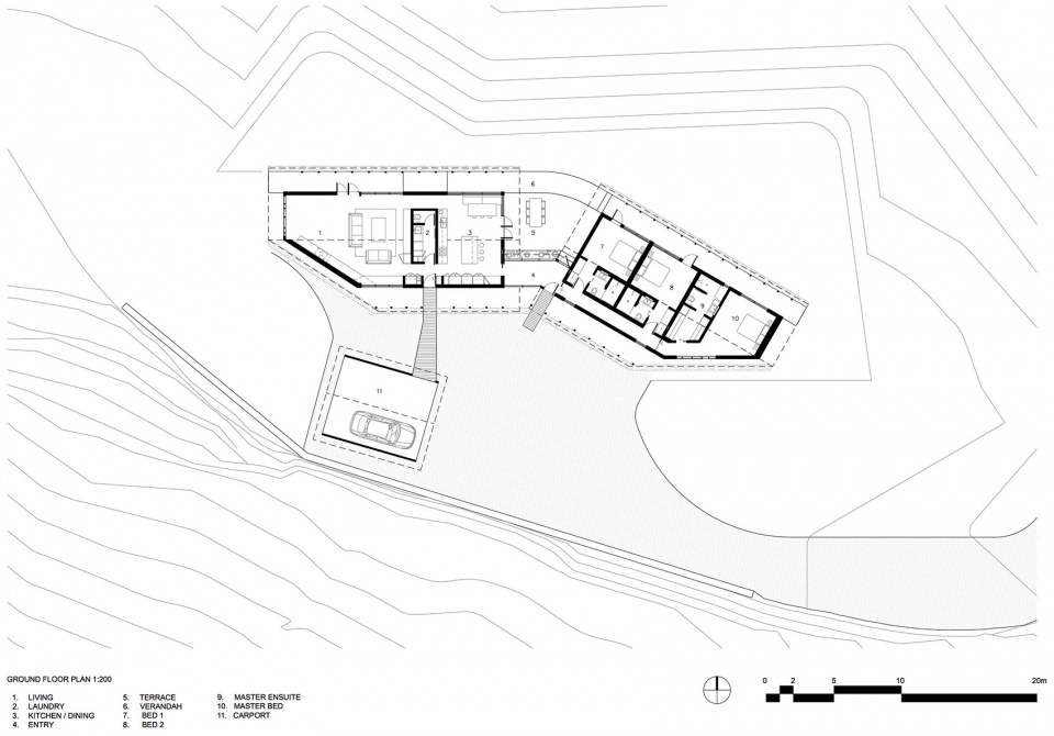 A loose court is present on the hill side of the house, created by the retaining wall, main house and carport/future bungalow. This space has been left open to change as the family’s needs grow in the future.