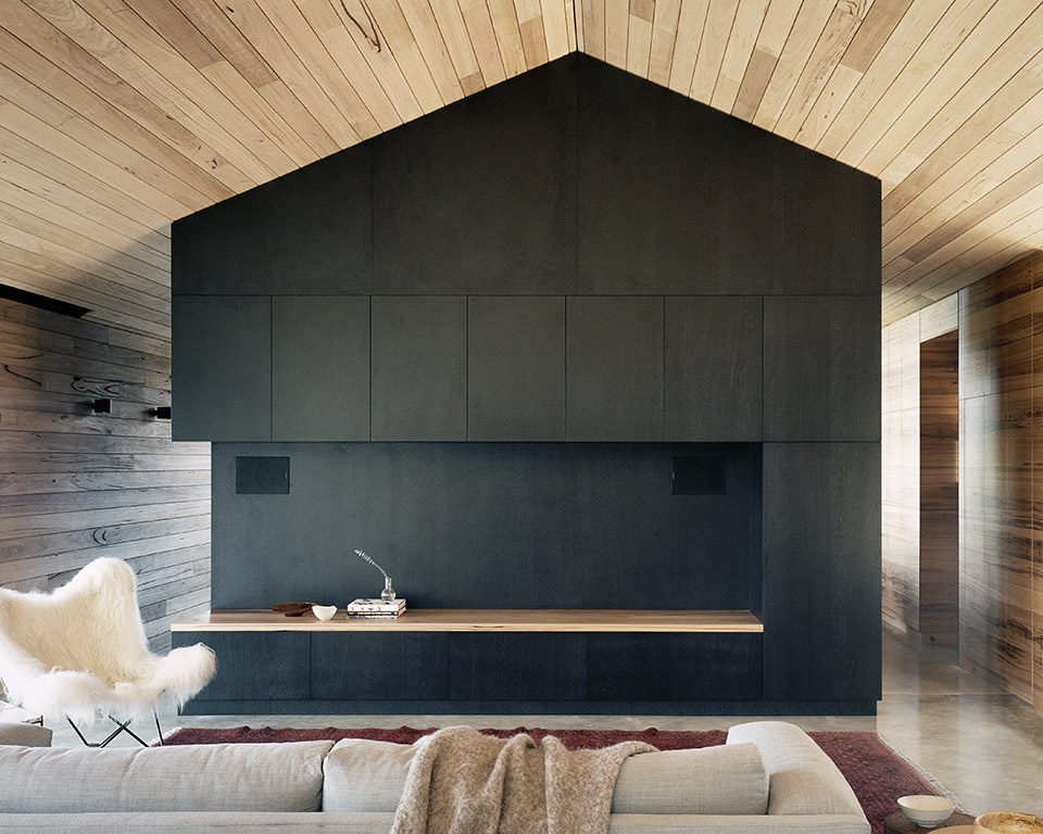 构成房屋公共和私人区域的两座棚屋,拥有几乎相同但呈镜像分布的三角屋顶。房屋的内衬由原木打造,表皮为全黑焦木。两间屋子相互独立,但又通过室内玻璃长廊、外部露台和走廊保持联系。 它们与现有场地的轮廓对齐,彼此弯曲相对,增加了就寝区和卧室的私密性。